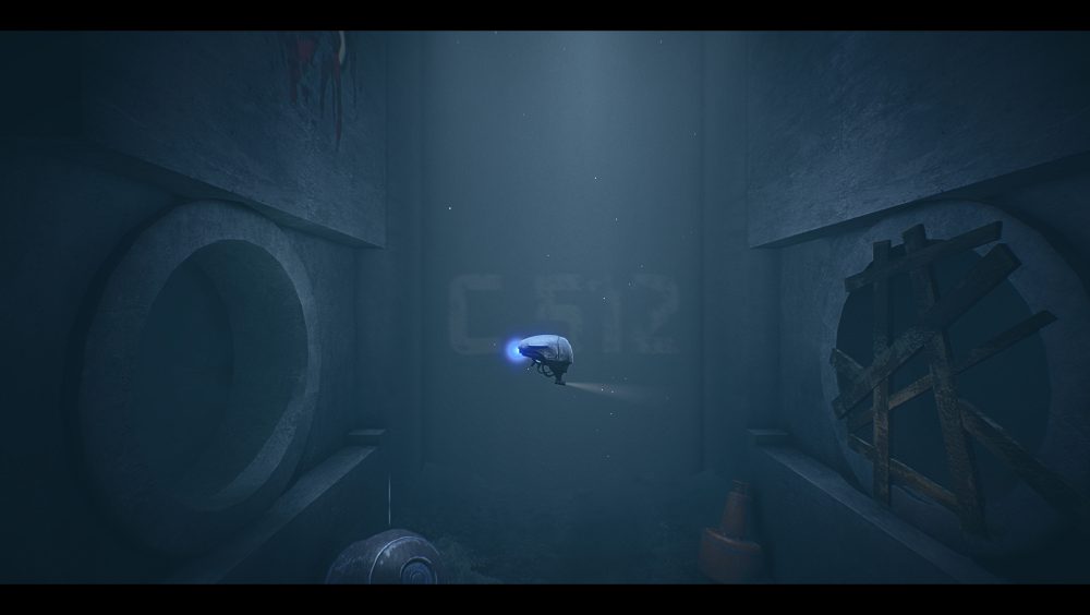 In terms of the story, you are not told it directly, however indirectly through the visuals of the world around you. Sometimes it can be very confusing however the visual background very cleverly uses the space by drawing your attention to inform you of what is happening and enforcing the dystopian tone of the world. There is little to no dialogue, however, the sound design is key to helping drive the narrative forward. For example. Early on in the game you are given a puzzle where you must activate a blacklight in order to see a code written on the wall. In order to turn on the black light you must select and use the music on a turntable to unlock a device that reveals the message. This is a very clever use of sound to one solve a puzzle and two to drive the narrative forward by revealing key information relevant to the story.