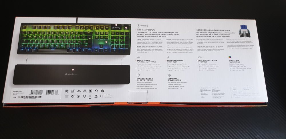 On the front of the box, SteelSeries have chosen to show off the keyboard, its lighting, and on the far right mentioning the OLED SMART DISPLAY.