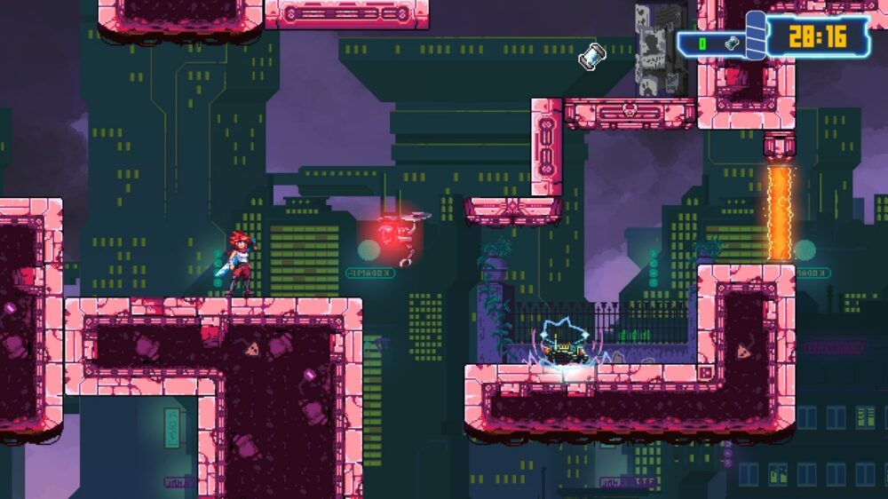 Players will jump, slide, throw their dagger through gaps and laser walls, avoid deadly robot foes, leap over spike traps and much more in the levels on offer in Aeon Drive. Each area brings with it a variation on the gameβs environmental design and the locales on offer are all filled with gorgeous pixel art. The pixel artists who worked on this game did an amazing job because every single level is filled with such beautiful art, itβs a visual feast for the eyes. In fact, the art alone was reason enough for me to replay levels just so that I could see more of some areas.