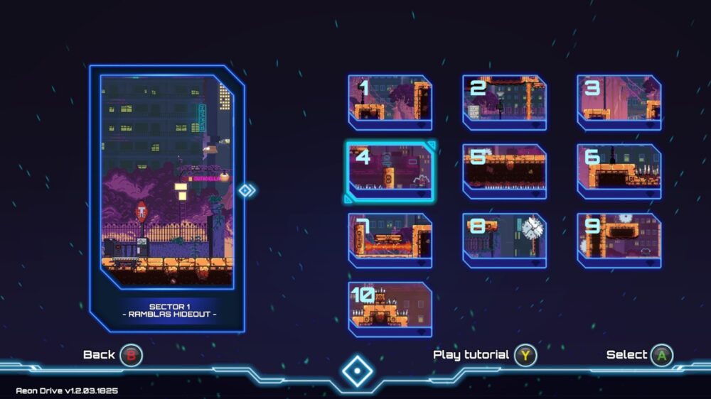Launching the game, players will be treated to a beautiful intro cinematic with an absolute banger of a song sung by Megan McDuffee (You might remember her from her vocal OST work on the equally as awesome, River City Girls). The story of Aeon Drive is pretty straightforward. Players will take on the role of Jackelyne, who is also known less formally as Jack. Jack ends up in a new dimension featuring a neon-soaked futuristic Earth and lands in Neo Barcelona. Her shipβs reactor however is about to go critical and take the entire planet with her unless she retrieves her lost power cells and stabilises the core.