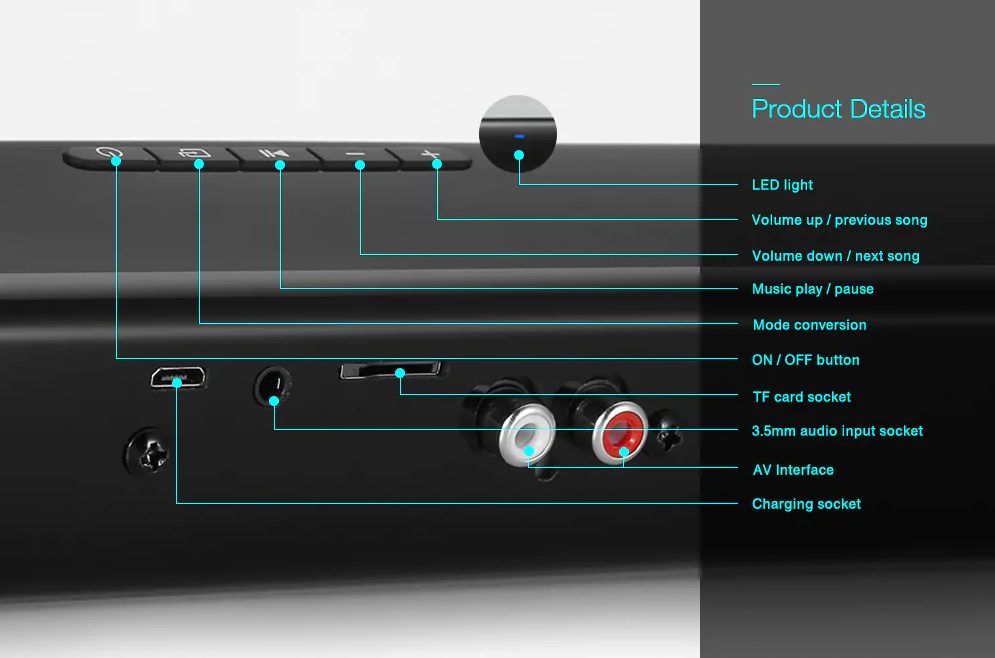 Now when it arrived, it was in perfect condition, which is great since the distance it travelled and all the horror stories you hear online about packages arriving damaged, broken or simply going missing thanks to our amazing UK postal service. On the box, it has a full view of what the soundbar looks like, basic specs and connections available. Opening it up, inside you get the soundbar obviously, a micro USB Charging Cable but no charger itself, so that’s an added cost if you do not have a mobile phone or another device that has a way to charge off a USB connection. There is also an AUX 3.5mm Audio jack and a remote control.