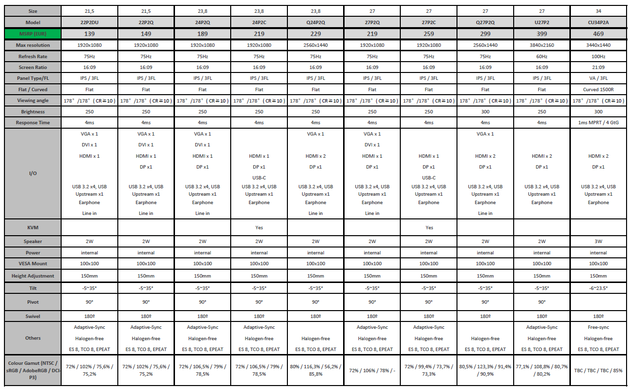 All models (except U27P2 and CU34P2A) support 4 ms response time and 75 Hz refresh rate. This 25% increase compared to common 60 Hz monitors and the VRR support achieve far smoother cursor movement and general responsiveness, free of tearing or stuttering.