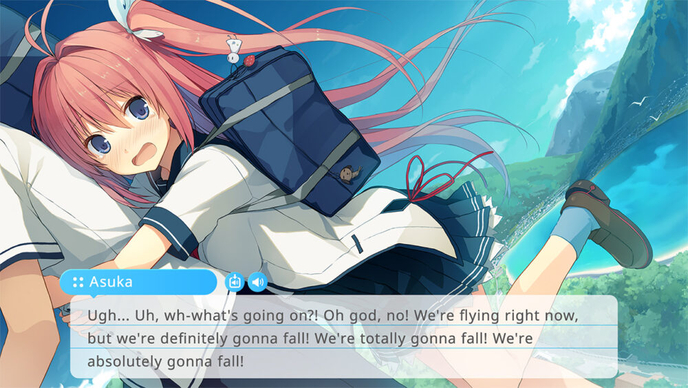 Aokana’s main plot device lies with the anti-gravity shoes and the “Flying Circus” event that the main character and the girls themselves get involved in. However, the “Flying Circus” event is pretty lacklustre when compared to the character development and scenarios that play directly into it. There is a lot of content in Aokana and the choices players make will affect the overall outcome of the game leading to an ending with each of the four girls based on whether or not you choose to romance them. Players will therefore have a lot of new story and additional backstory explained to them if they play through all the routes and eventually unlock the true ending. The quick save and quick load feature is immensely useful in this regard as well as the ability to skip through text to save time.