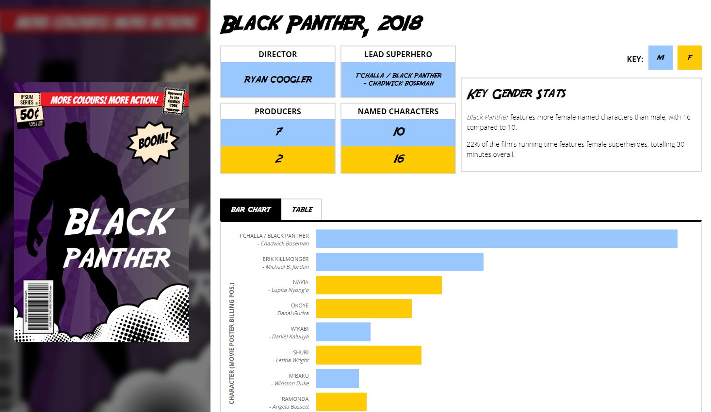 The interactive also features key summary data for each film, including how Black Panther (2018) includes the highest amount of named female characters compared to men (16 vs 10). The Dark Knight Rises (2012) features 18 named characters, three of which are women.