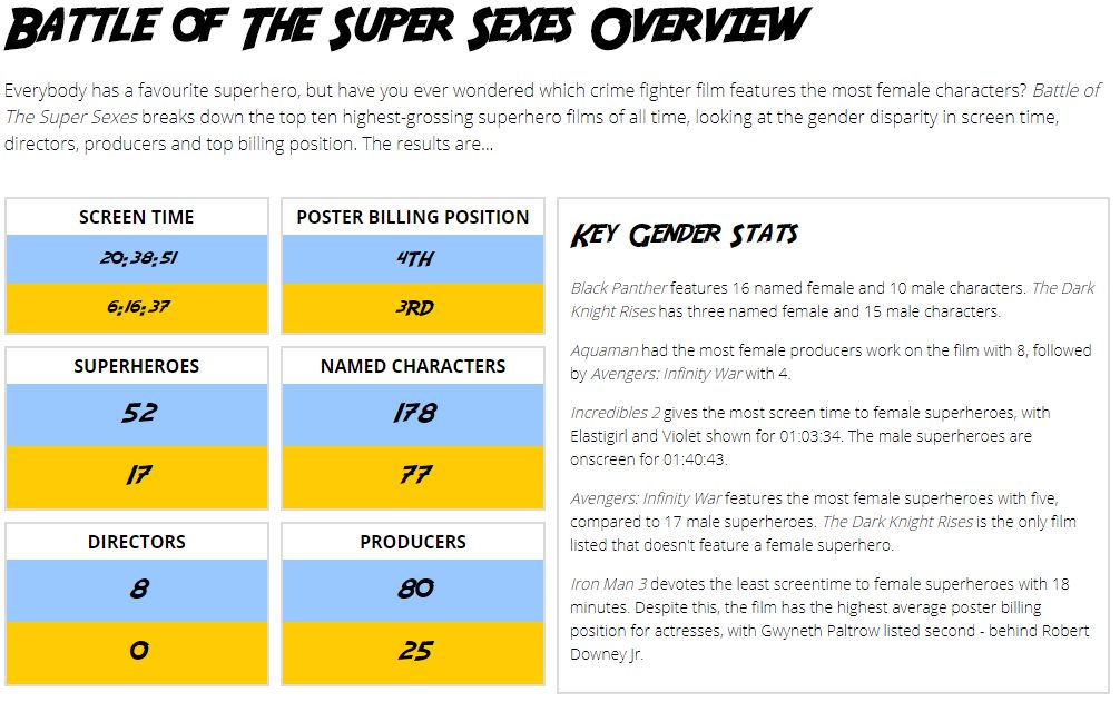 Information from Battle of The Super Sexes features key gender stats from the top ten highest grossing superhero movies across a number of categories, including screen time, the number of directors and producers, named characters, movie poster billing position and more.