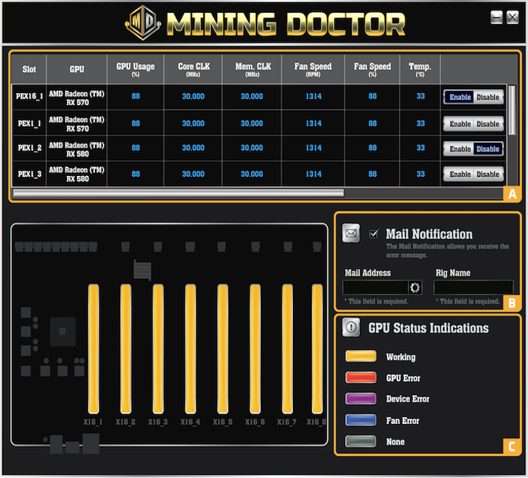 Mining Doctor software checks the current state of each GPU such as usage, core, clock speed, memory clock speed, fan speed, and temperature. In addition, if the iMiner detects an error state, it automatically sends an email notification, making it easier to manage scaled mining farm remotely.