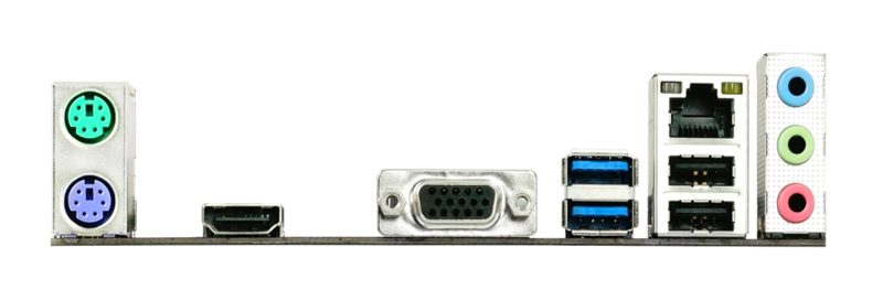 The BIOSTAR A68MHE’s rear I/O includes 1 x PS/2 Mouse, 1 x PS/2 Keyboard, 2 x USB 3.1 Gen1 (5Gb/s) Ports, 2 x USB 2.0 Ports, 1 x HDMI Connector (supports 2K/4K resolution depending on the CPU), 1 x VGA Port, 1 x GbE LAN port, and 3 x Audio Jacks.