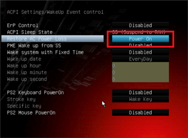 Step 2: Go to Advanced / ACPI settings / Restore AC Power Loss and set as Power On