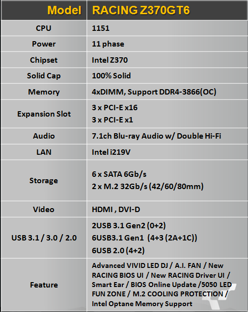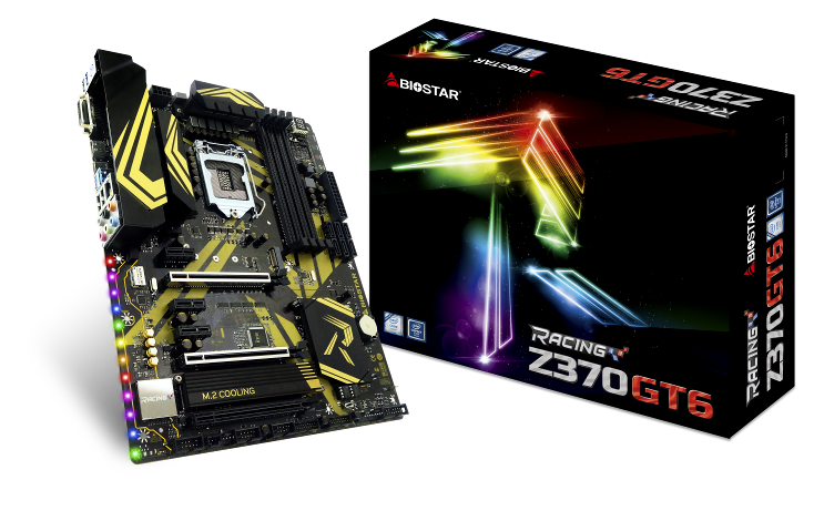 The BIOSTAR RACING Z370GT6 motherboard which supports the new 8th generation Intel Core processors, is the company’s first 3rd generation RACING motherboard that features new luxurious golden theme ‘tattoo’ design, revamped user-friendly BIOS and driver utilities for full control cooling of A.I. FAN, full control of RGB lighting with the Advanced VIVID LED DJ and GT Touch to enable the ECO and Sport modes.