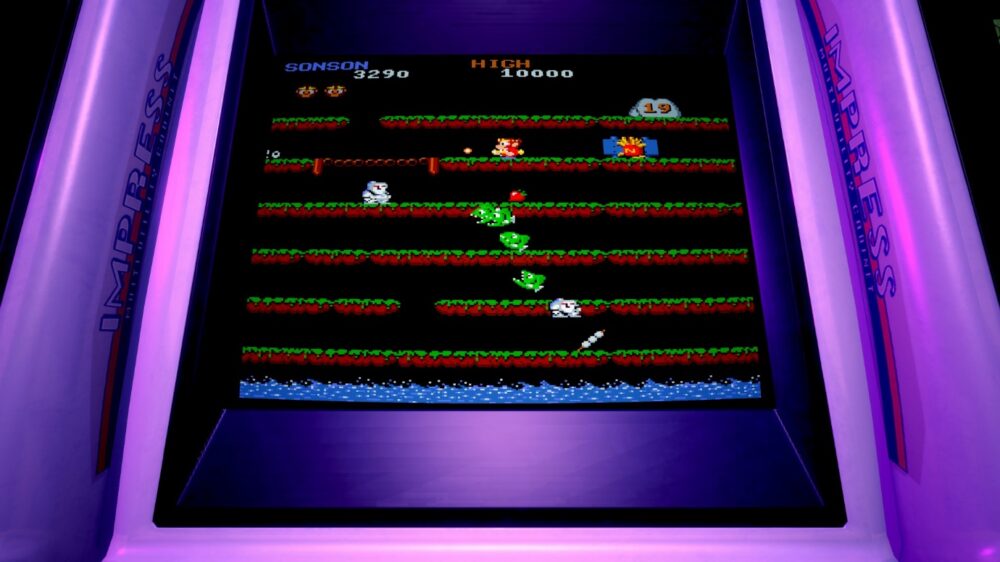 The free version of the Capcom Arcade 2nd Stadium includes SonSon. This is a title where you play as a character that jumps around a side-scrolling environment and can fire off projectiles towards enemies that race towards you. You can collect fruit and other items and rack up high scores. It’s fairly simplistic and definitely shows its age. This is a game from 1984 after all but is still surprisingly enjoyable.