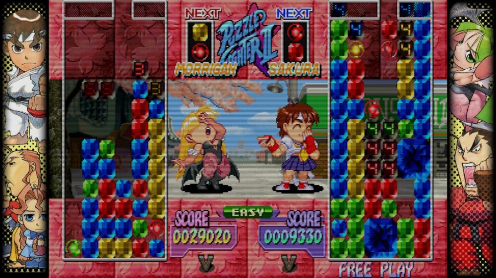 Speaking of gems, Super Puzzle Fighter II Turbo features players engaging in a Puyo Puyo-style game where they will match different coloured gems in a grid. Clearing gems of the same colour will then unleash an attack on their opponent. Yes it’s formulaic and we’ve seen it with other franchises and titles before but the Street Fighter chibi character flavour makes it a tonne of fun.