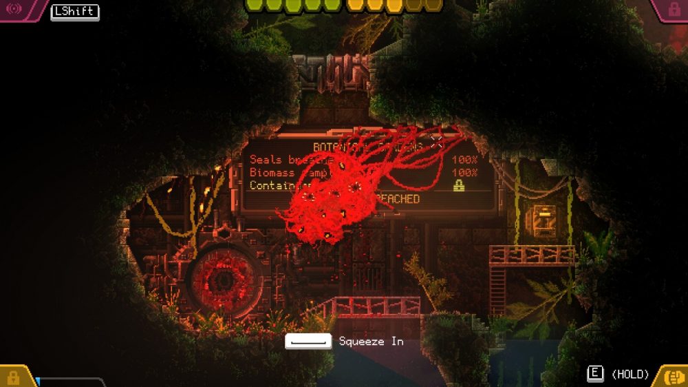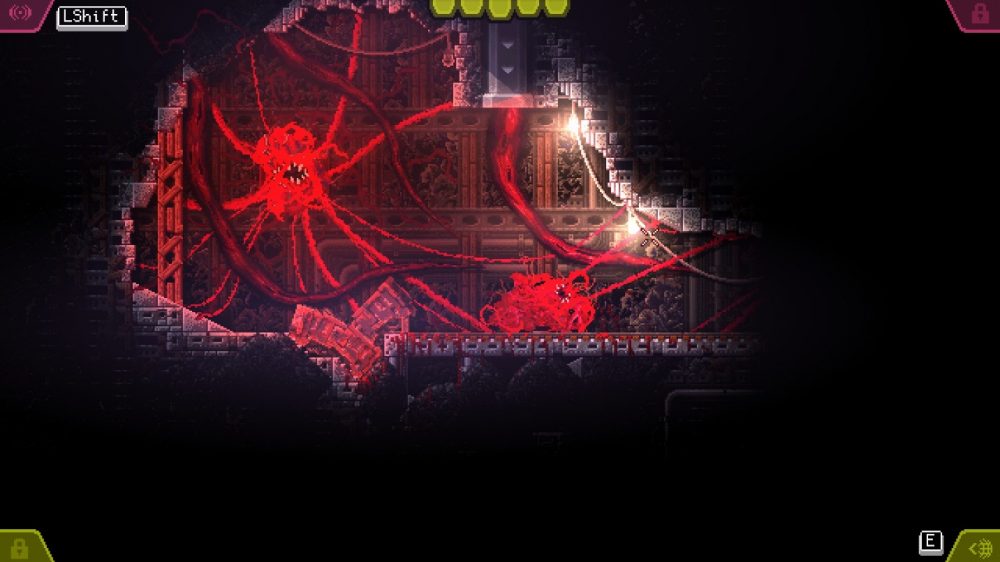 As the game goes on though, Carrion evolves into a much deeper platforming adventure. Players will gain upgrades and subsequently, biomass, as they delve deeper into the facility. Your beastly blob character will gain the ability to fire a web-like projectile which can be used to activate switches or levers that are out of reach. Later, you’ll be able to smash through reinforced wooden structures and much more.