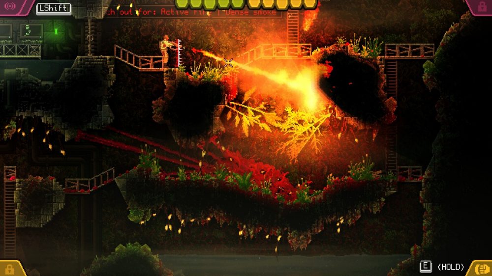 Enemies in Carrion include basic science personnel armed with guns to more advanced containment personnel packing some serious heat. Literally in many cases, since this containment personnel can be carrying flamethrowers. Dodging security and enacting sweet tentacled vengeance against those who have “wronged” you are vicious, visceral and voraciously villainous. Yes, you are the big bad monster devouring humans here but morality is up in the air in Carrion.