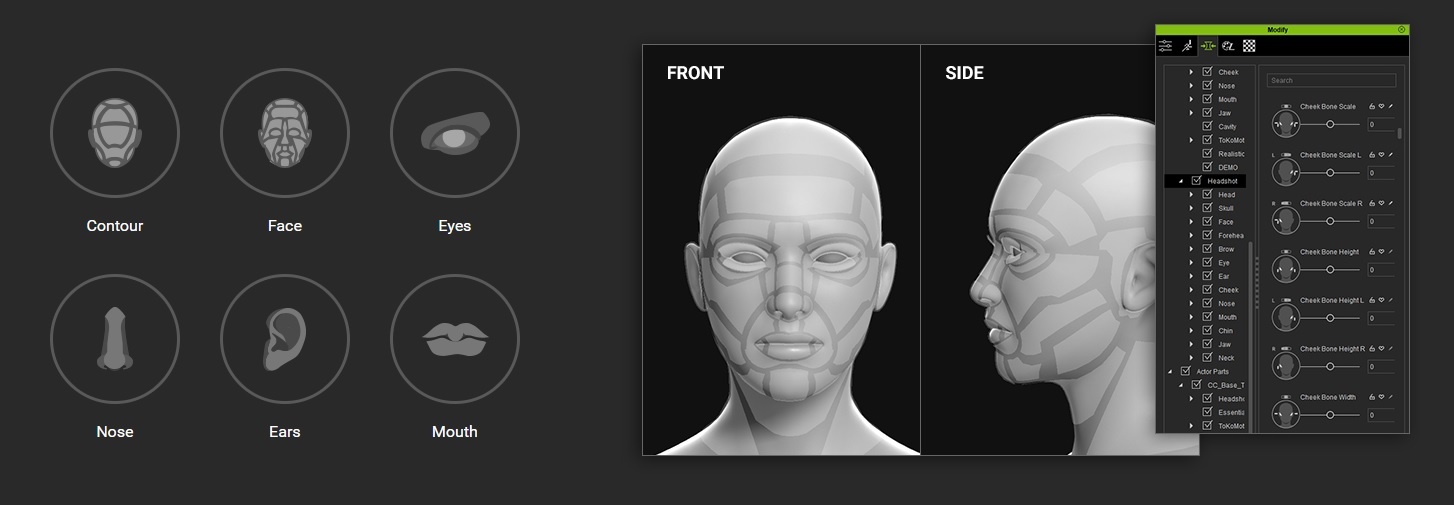 The 3D Head Morph System: Headshot Morph 1000+ is designed to achieve the professional and detailed look of 3D scan models. The intuitive 3D sculpting design allow users to hover over a control area and use directional mouse drags to adjust the corresponding mesh shape, from full head and face sculpting to individual features- head contour, face, eyes, nose, mouth, and ears with more than 1000 head morphs. It is now free with a purchase of Headshot Plug-in.