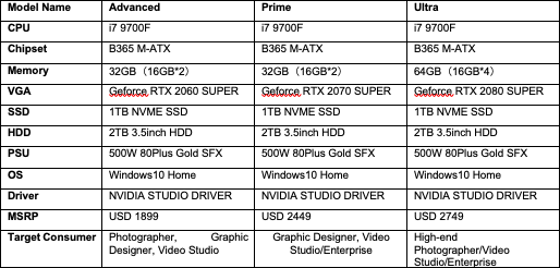 Scale to your needs with the COLORFUL’s varying options. COLORFUL offers the ProMaster H1 PC with 3 variants from Advanced, Prime and Ultra so professionals can pick just the right amount of performance for their needs. All models come with an Intel 9th-generation Core i7 9700F eight-core processor, a 2TB hard drive, a 500W 80Plus Gold SFX power supply. Scale from an GeForce RTX 2060 SUPER for lighter projects all the way up to an GeForce RTX 2080 SUPER for more specialized applications. From photographers, layout artists, graphics designer all the to a production house, COLORFUL has something for you.