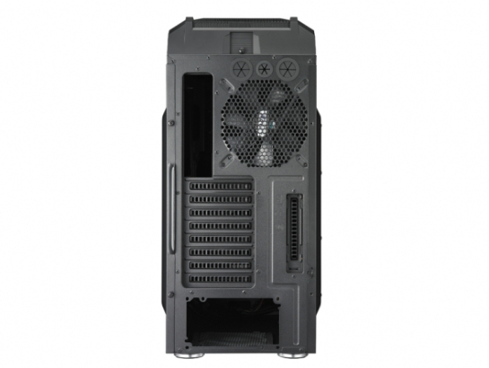 Besides the front I/O with USB 3.0 and other connectivity and a storage tray just behind it, the back two thirds of the mesh covered top is removable for access to change the fan arrangement from the 200mm fan already installed here. Both sides of the chassis offer the bump-out that the HAF 922 had, just shaped slightly different and the left panel offers an area for fans and a large plastic handle to release this panel. The back of the chassis offers a 140 mm exhaust fan with an 8+1 expansion slot configuration and a bottom mounted PSU with a dust filter.