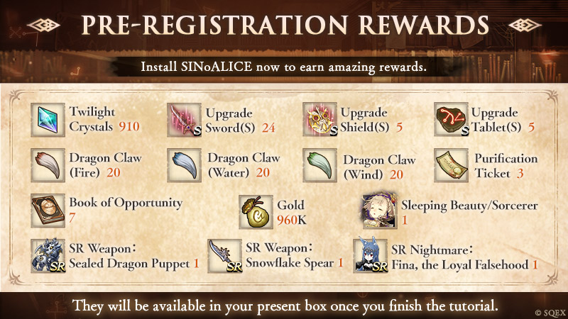 As a thank you to the more than 2,000,000 players who have pre-registered for SINoALICE, fans will receive 14 in-game items and 910 Twilight Crystals—enough for three 11-item gacha draws. Rewards can be found inside of the present box after finishing the tutorial.