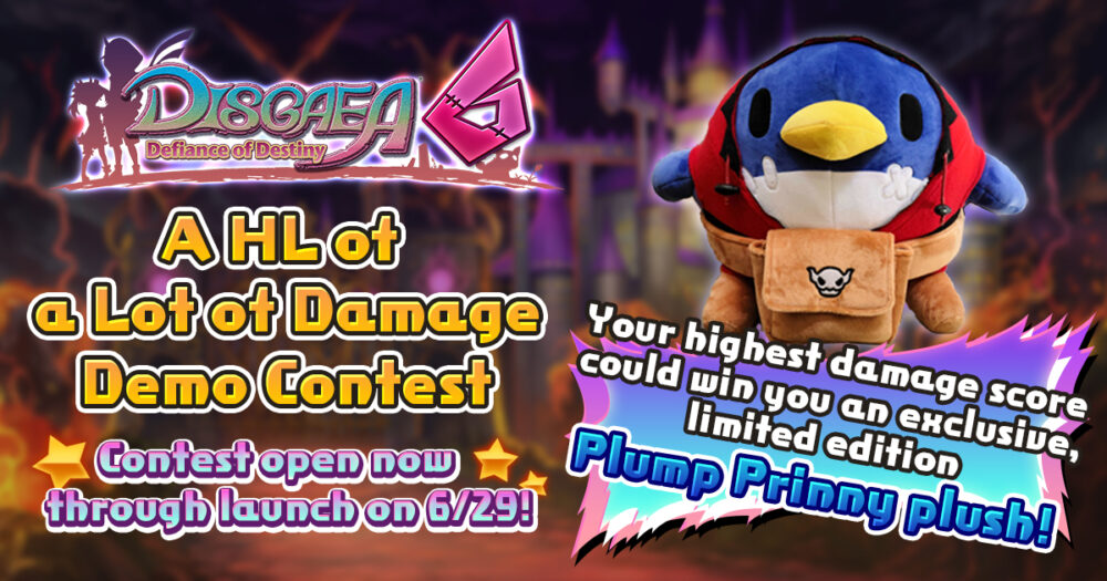 “A HL of a Lot of Damage” Demo Contest Enter the Disgaea 6: Defiance of Destiny “A HL of a Lot of Damage” Demo Contest for the chance to win a custom Plump “Zed” Prinny Plush, outfitted with a one-of-a-kind zombie hoodie. To participate, entrants must first download the free demo from the Nintendo eShop, take an in-game screenshot of their highest attack damage, then submit to the contest page.