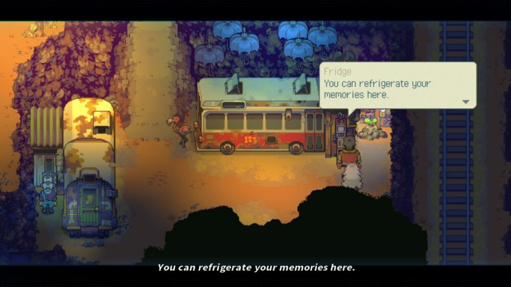 Gameplay in Eastward involves exploring areas and using either John or Sam to get through puzzles which will then allow you to progress further. If you’ve played any 90s RPG video game, you’ll know what to expect here. There’s exploring, speaking to NPCs, getting quests, and unlocking new abilities or items which will help you progress further but for the most part, despite having a large world to explore, Eastward is still quite linear. Oh and you save your game at fridges which are scattered throughout the game world.