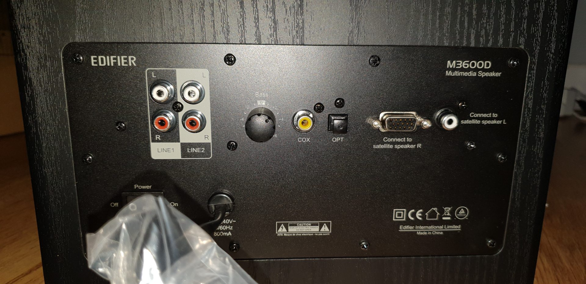 Now, this is odd, I have never seen a connection for a speaker like they have used for the right speaker, it is the same as a VGA connector used for a monitor, then for the left speaker they have used a standard connection RCA. I had to ask Edifier why they have used such an odd connection and this was the answer I got … “We need so many cables run through satellite and subwoofer, the cable only use VGA connector, is not VGA standard cable” Now I am still confused as I have seen loads of speakers with the same setup and none of them have used a VGA to connect up a speaker, they have all used an RCA connection.