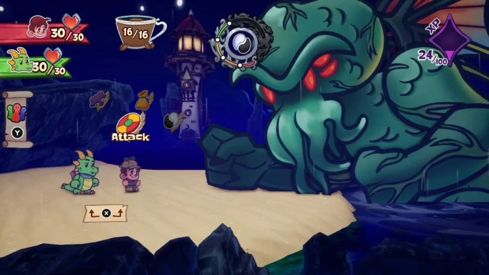 Battles are fun, if somewhat low stakes affairs. Enemy health tends to stay in the double digit numbers. There’s no power-leveling here either as there’s a set number of encounters per area and you’re going to be at just the right level the story needs of you.