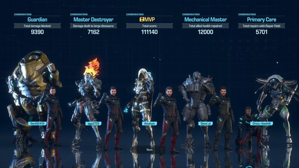 Players will gain experience points as they play through the game and their exosuits will each level up based on how often you play them. This can be a bit frustrating at first if you purely play only one type of exosuit class but put in enough time and all of your suits will become formidable enough to take on the tougher foes. Levelling up different exosuits feels rewarding as you unlock better upgrades, buffs and perks which can lower your attack cooldowns or increase your damage output or healing.