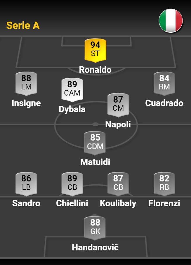 - Best possible 11: Handanovic – Sandrom, Chiellini, Koulibaly, Florenzi – Matuidi, Napoli, Dybala, Insigne, Cuadrado – Ronaldo