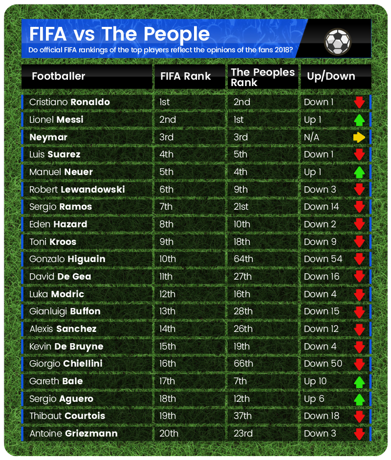 As a result, football specialists at Ticketgum.com sought to investigate whether FIFA’s top players* are truly the fans favourites. The numbers were found by comparing FIFA 18 player ratings with those that feature on Ranker.com* in order to see whether the public agree with FIFA’s analysis of who they determine are the world’s best players in 2018.