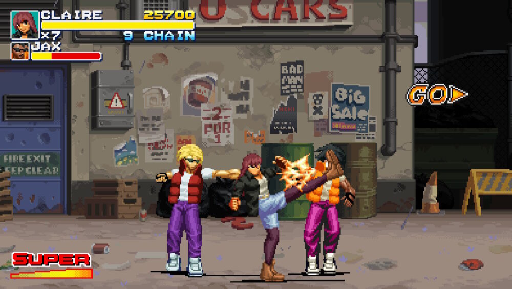 Choosing one of our three protagonists, you’re popped into the first grungy street you can find and proceed to lay down punches and kicks with the best of them. Each playable character has their own fighting styles, move sets and speed. Miller is the tank of the group and as an ex-wrestler he moves slowly while Duke and Claire are much faster. Claire’s combos chain together faster while Duke feels like an all-rounder. You’ve got one attack button, a block which can be broken after time, a jump and an area clearing super. Double pushing in a direction lets you run. Throws require you to get in close and auto-activate. The game doesn’t give you a move list, just the basics you can do with advanced moves requiring experimentation on your part to find. But when you do, they become essential, such as the default throw turning into a rolling throw that takes down other enemies if you hold down the directional button in the opposite direction. And if you want to stomp on someone while they’re down, well you can do that too.