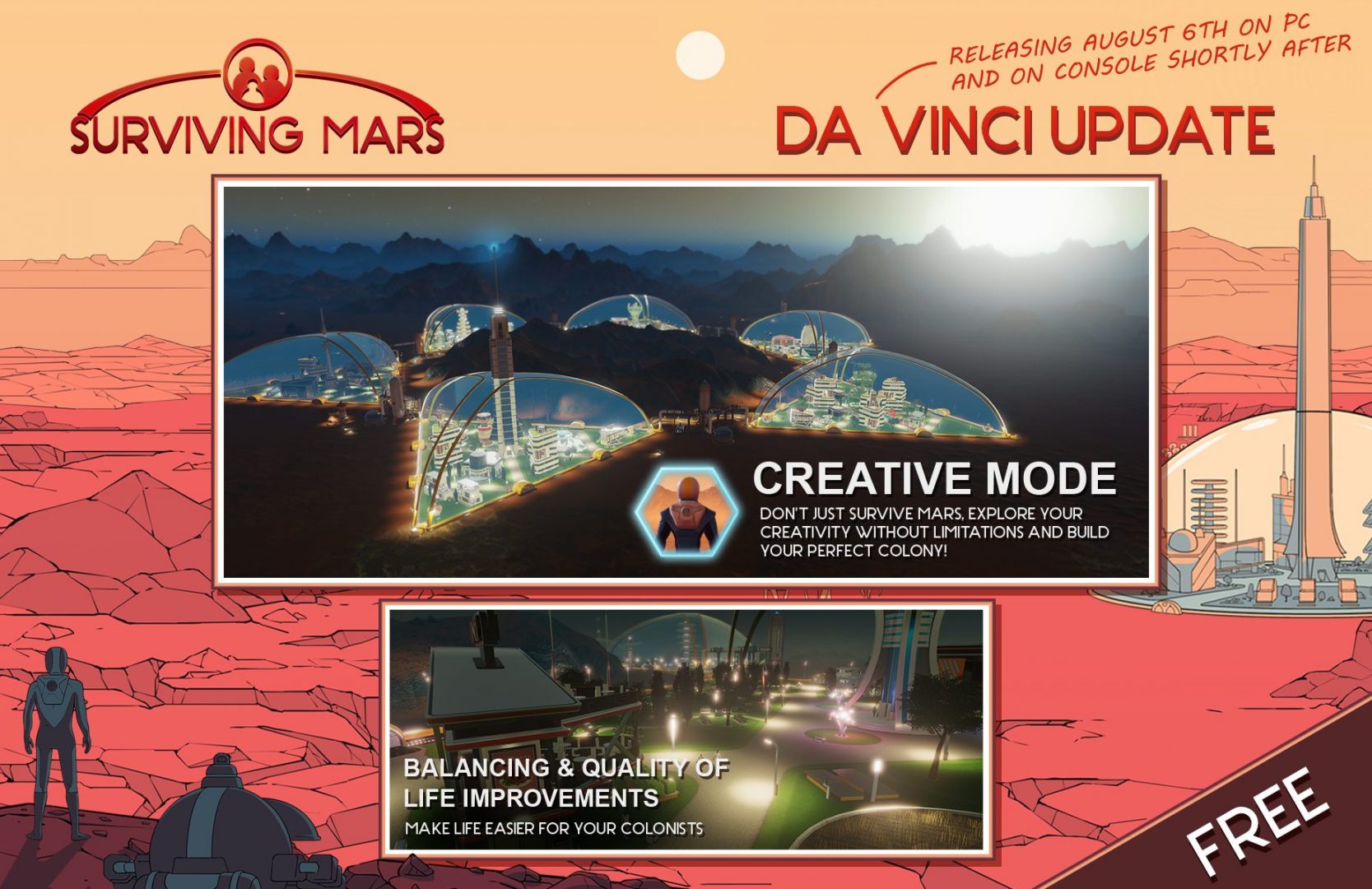 Paradox Interactive has announced two new free updates for Surviving Mars, “Da Vinci,” or Creative Mode, will allow players to take more creative liberties with their Martian colonies and is available now for PC and consoles shortly after. This update includes stress-reducing features such as buildings that do not require maintenance, immortal colonists, and a starting budget of $100 trillion. The “Sagan” update, for the explorer who felt that surviving the inhospitable desert of Mars was simply too easy, will launch for all platforms in September. Including 24 major challenges to overcome, this update adds a new level of difficulty for the hardcore survivalist who’s ready to take a running start at everything the red planet can throw at them.