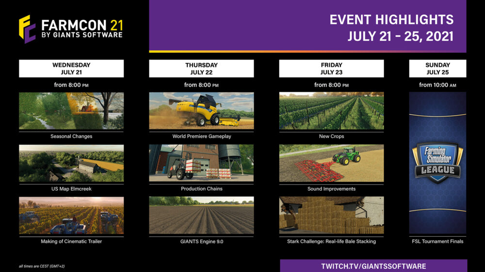 At this year’s FarmCon, Farming Simulator 22 will be the main theme of GIANTS Software’s own annual event. Streamed from July 21st to July 23rd on the official GIANTS Software Twitch channel. Tune in as publisher and developer GIANTS Software shows a first look at Farming Simulator 22 gameplay footage.