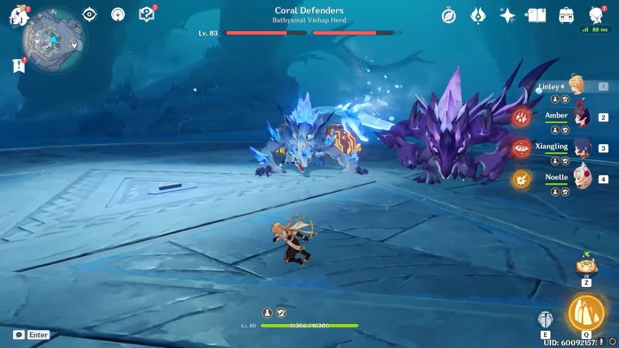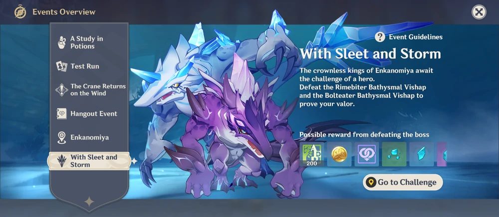 This simple event challenge takes place in the new map, Enkanomiya. You must defeat a Bathysmal Vishap herd (a new monster type introduced with the 2.4 patch) composed of one Rimebitter Bathysmal Vishap and one Bolteater Bathysmal Vishap.