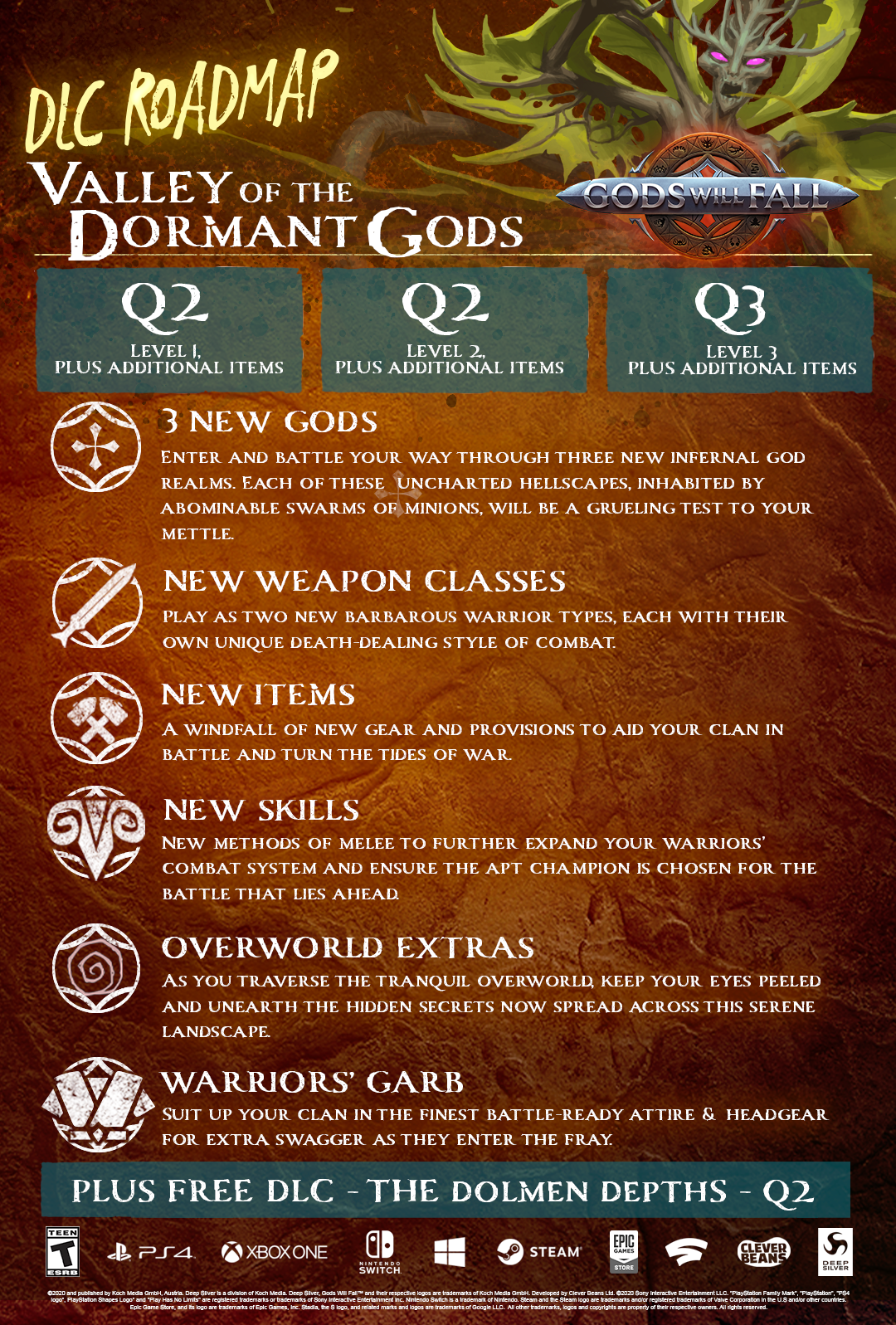 In addition, Dolmen Depths is completely free for all via a patch in Q2. Delve into a mysterious underworld of the Dolmen Depths and fight to bring a long lost warrior back from the beyond and into your party. A new, procedurally generated dungeon environment, brimming with enemies, desperate to keep the dead where they belong.