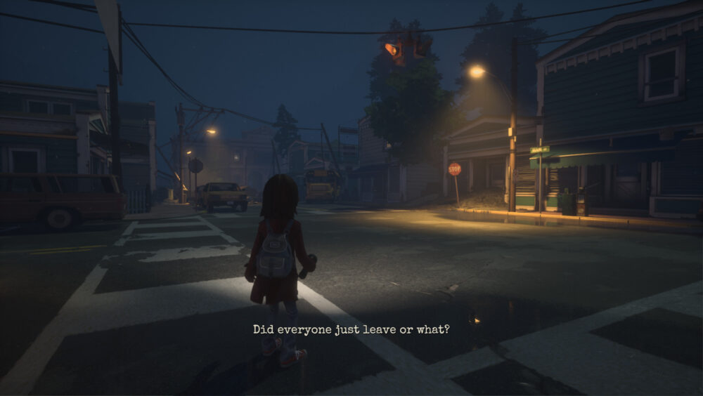 Events kick off when protagonist Sally is heckled and run off the road one night by another group of children while putting up posters for her missing cousin Emily. It’s been a month, interest is waning, and the local bullies have redirected their attention towards her – intimating she must have had a part to play in Emily’s disappearance. A mysterious meeting with an elderly stranger and one cable car ride later, Sally finds herself in a derelict and monster-infested version of her home town. She spots Emily through the upper floor windows of the school building and heads inside to find her despite the obvious danger.