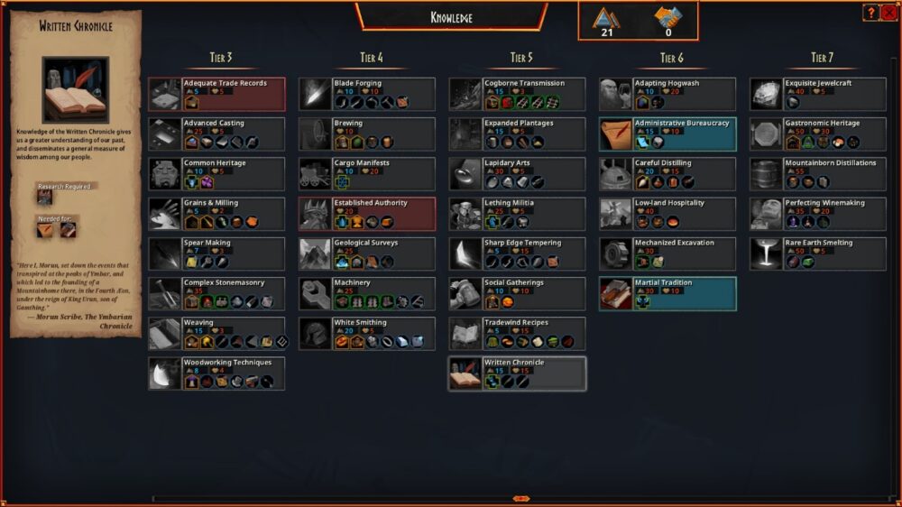 In addition to micro-managing the entirety of your dwarven population within the mountains, you will also need to dedicate yourself to trading in the Overworld with other cities or villages. You can also take on specific trade missions which involve delivering goods or items. Doing this levels up your trading abilities and awards you with trade lore. Therefore acquiring knowledge lore and trade lore are essential to progressing in Hammerting since, without these two things, you won’t be able to purchase further research and won’t be able to progress or keep your colony alive and well.