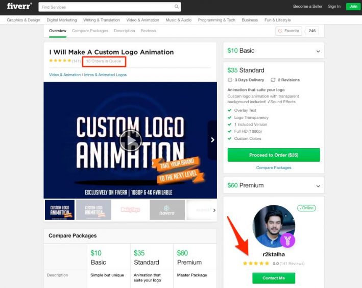 For example, this designer seems like a good fit for what I’m looking for based on the demo videos he shows. Also, there are some great reviews on the gig page and his profile has a 5 star review average, have a look: