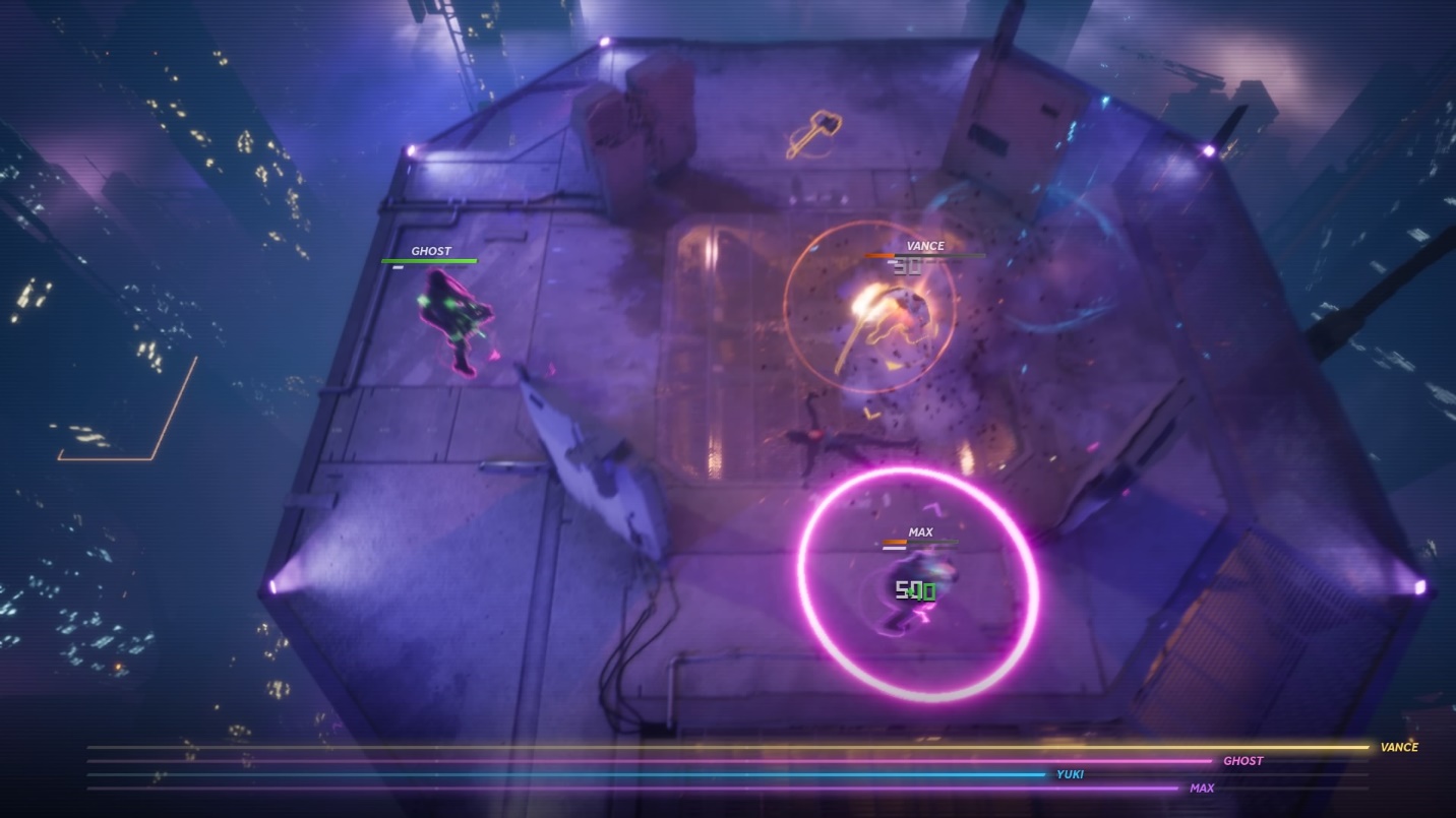 But with great power comes with even greater style. The 80’s era characters and neon-soaked visuals offer an almost embarrassingly good blend as a game. From the cool and suave to the mysterious and rugged. The characters that never really offer anything other than their striking forms puts the balance of fair play. While each of the six arenas present their own styles such as atop a Miami Hotel to a Neo-Tokyo subway filled with their own set of hazards and choke points as well as a killer synthwave soundtrack from the likes of Carpenter Brut, Dance With The Dead, Meteor and more.