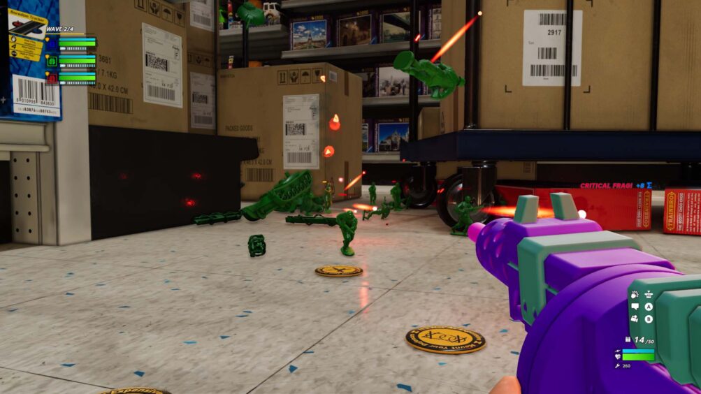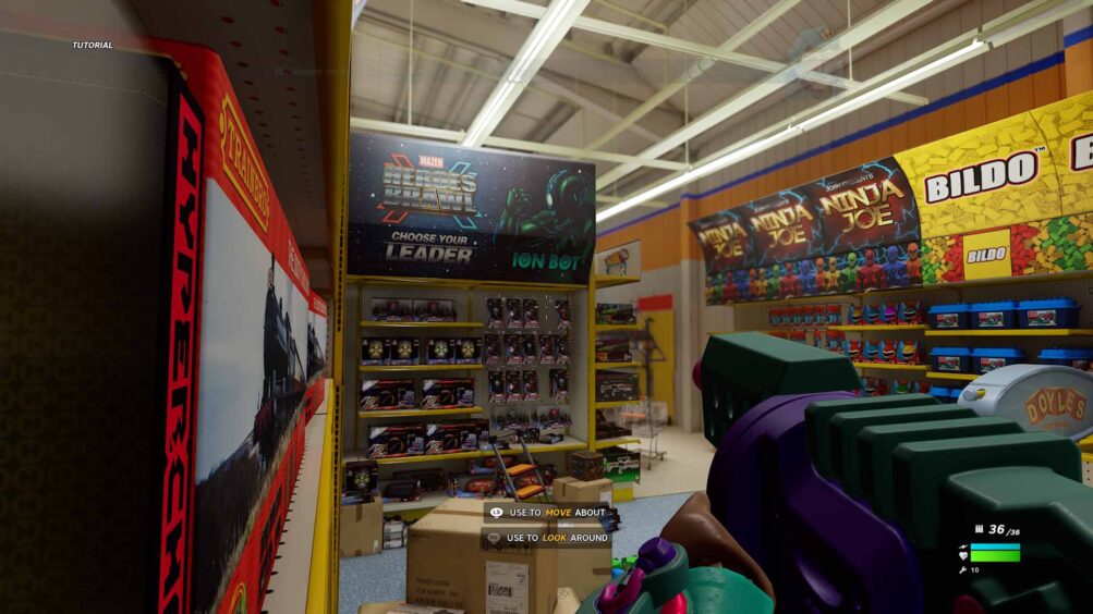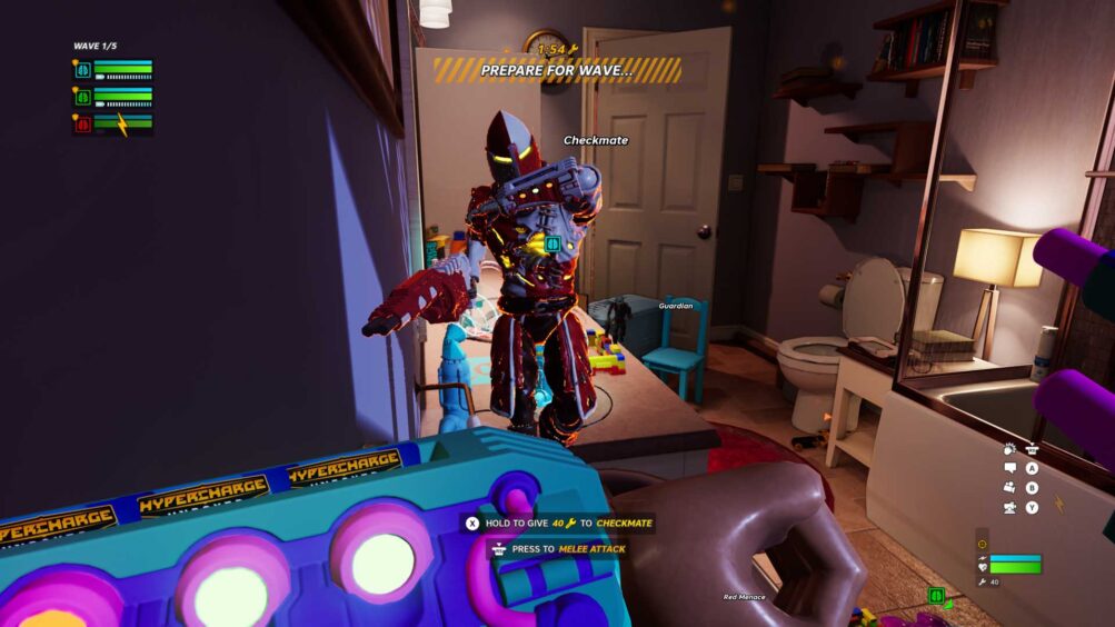 You commit all this miniature warfare in a multiplayer horde mode, a tower defence shooter. You’re popped into the tiny shoes of an action figure and have to defend the Hypercores in life-size environments such as a child’s room, a kitchen, a toy store, etc.