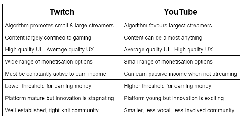 Unless you are already a hugely-successful streamer, then YouTube is a hard platform on which to find a following, get recognised, or make money. Twitch, on the other hand, lends itself to the smaller streamer, and has monetisation options almost from the get-go.