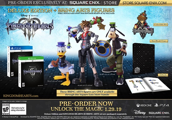 - Deluxe Edition + Bring Arts Figures – The KINGDOM HEARTS III Deluxe Edition and Bring Arts Sora, Donald, and Goofy Set bundled separately will be available in limited quantities for $229.99. Fans can now preorder the Xbox One and PlayStation 4 system versions exclusively from the SQUARE ENIX Online Store.