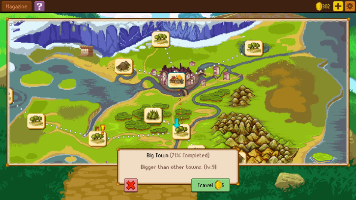 You move around by clicking on areas of the map, where your characters will then travel to, with a roll to determine if they get ambushed. In the new area you can choose between resting for hp and mp, fighting monsters, investigating for items or doing quests. While in a dungeon you will have a generated map that you will have to explore, fighting monsters, finding items and fountains of health till you eventually find stairs and reach the end-boss.