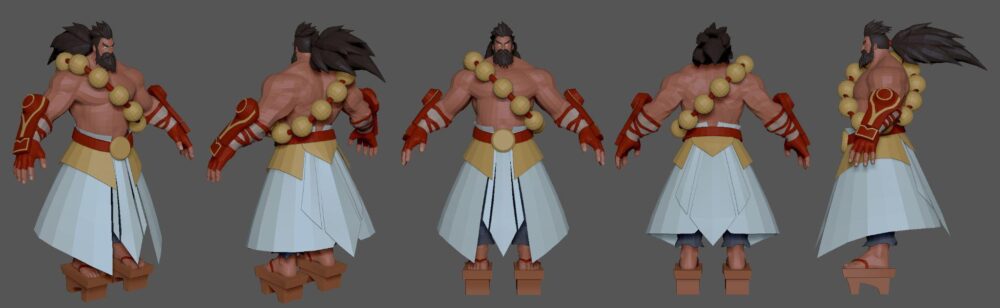 One of the goals for Spirit Guard is to keep some of the essence of old Udyr, so to do that it will represent the time he spent training in Ionia, and will also use the same animals as pre-VGU Udyr (Tiger, Bear, Turtle, and Phoenix). We wanted Spirit Guard to immortalize his old animal forms, while also cranking them up to 11. I don’t want to spoil everything yet, but I will leave you with concept art and an early model of his Spirit Guard skin before he channels one of his animal spirits.