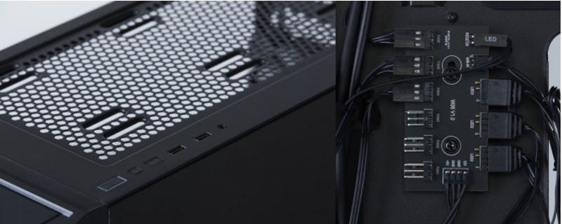 With multiple grommets surrounding the motherboard and cable routing holes on the PSU shroud, users can redirect cables behind the motherboard tray where plenty of cable tie points with Velcro straps are provided. In addition, the included fan hub which hosts the 3 included fans has extra room for up to 3 additional fans, simplifying the build process and cable management.