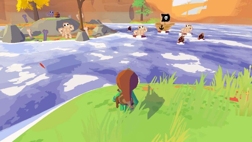 Set across two islands, Lil Gator throws you into the ultimate childhood roleplaying experience. Your friends are your quest-givers, the NPC’s that point you in which direction to go. The island park and all of its mountains and hills, your world to explore and overcome while enemies hide across the landscape in the form of cardboard cut-outs, some held aloft by balloons while makeshift treasure chests are hidden away in hard-to-reach locations. It’s an environment rife with exploration opportunities.