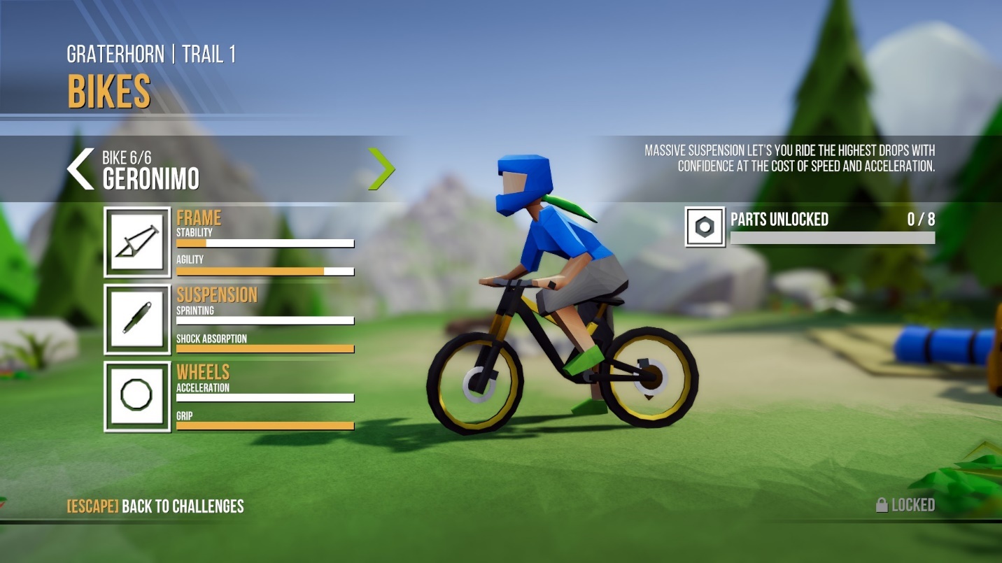 Progression in Lonely Mountains: Downhill involves beating specific times on certain trails and unlocking new ones. Players can also unlock bike parts which are used to unlock new bikes which handle completely differently to other bikes. There’s plenty on offer in the game so unlocking the new bikes is something you’ll definitely want to do to experience different playstyles throughout. There is a minor gripe to be had with this though and that’s because you’ll need to unlock all the specific parts before you get awarded with a brand new bike. This can be annoying or tedious at times because some mountain trails are downright dastardly in their difficulty and you’ll be stuck on them for ages until you manage to perfect your riding. However, when you do eventually perfect a trail, the feeling of satisfaction you get is extremely rewarding.