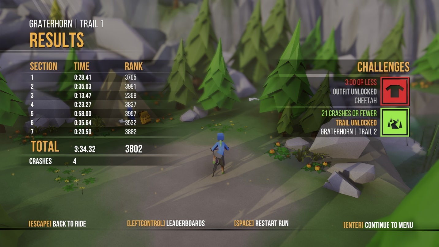 Lonely Mountains: Downhill on PC, played with a mouse and keyboard is incredibly hard. You’ll crash at least 20 or more times before you get used to the controls and even then, we would recommend you just use a controller since it makes your biking life so much easier. With that said, controlling your bike with a controller is extremely enjoyable but still challenging in its own right. You’ll probably still crash, a lot, but once you get the hang of the game, you’ll be chasing down time trials and setting leaderboard records in no time.