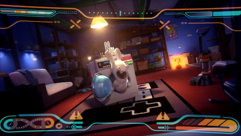 But one Rabbid takes hold of the SUPERMERGE and creates all new Rabbid Merges, welcome Rabbid Peach, Rabbid Mario, even Rabbid Luigi and much more. There fun and frolics in the girl’s room does not end too well, as the Rabbid using the headset targets the washing machine and all the Rabbids get sucked back in, including a poster of the Mushroom Kingdom.
