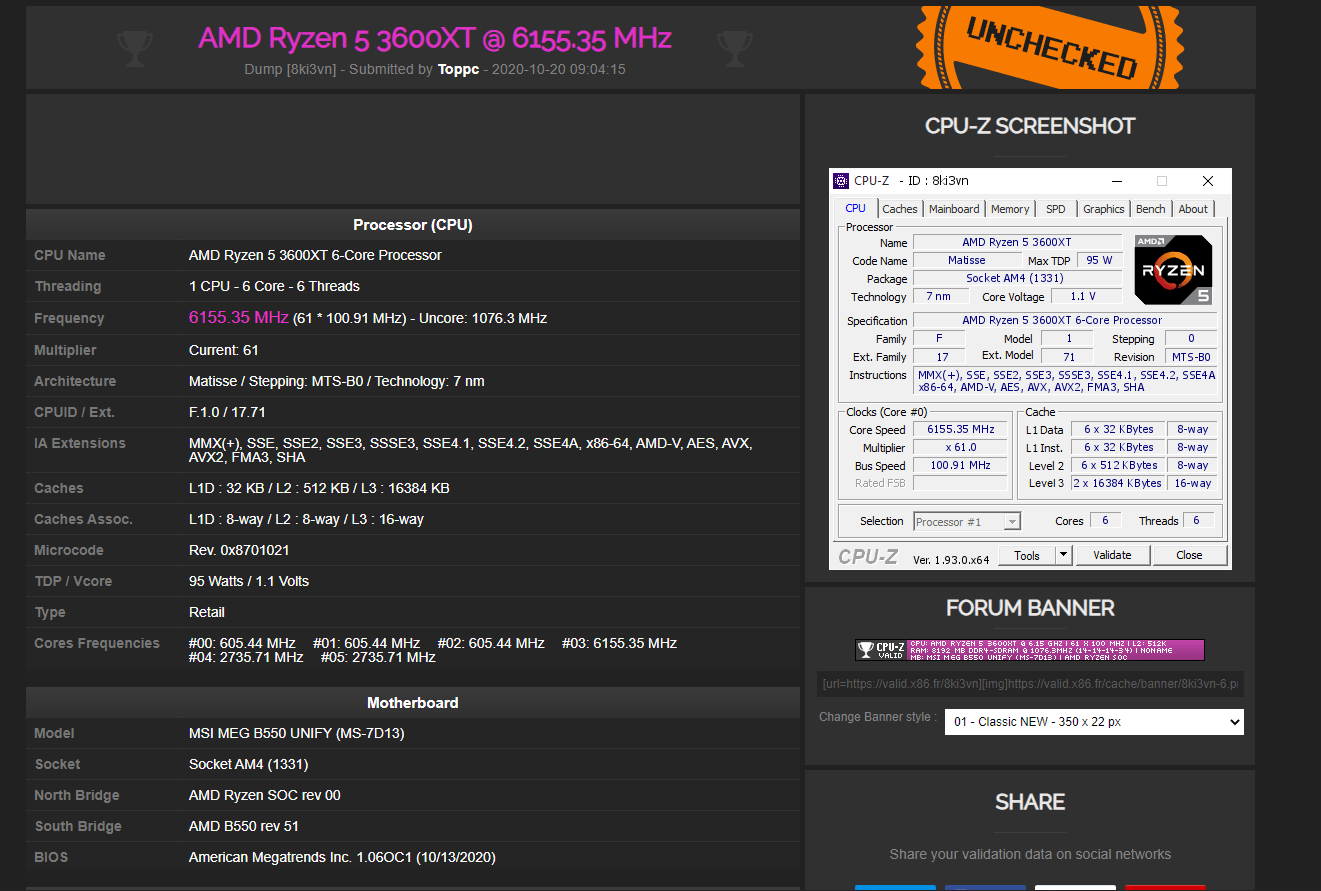 Emphasizing the ultimate performance, MEG B550 UNIFY brings astonishing overclocking records to enthusiast gamers. With AMD Ryzen 5 3600XT processor, it is an incredible result to push CPU frequency to 6155.35 MHz, becoming the world’s record breaker once again.