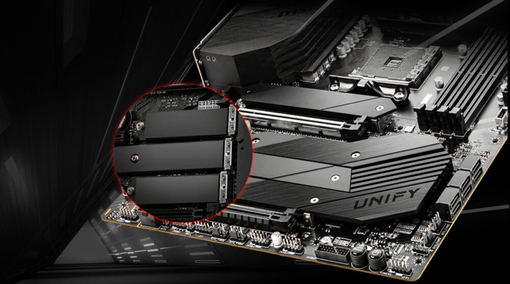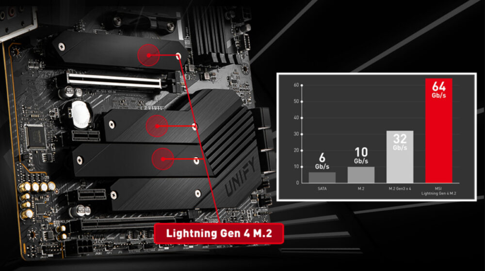 MEG B550 UNIFY series motherboard features exclusive onboard quadruple M.2 connectors for the maximum storage performance. Three of them support Lightning Gen 4 solution which is the fastest onboard storage on the market with up to 64 Gb/s transfer speed.