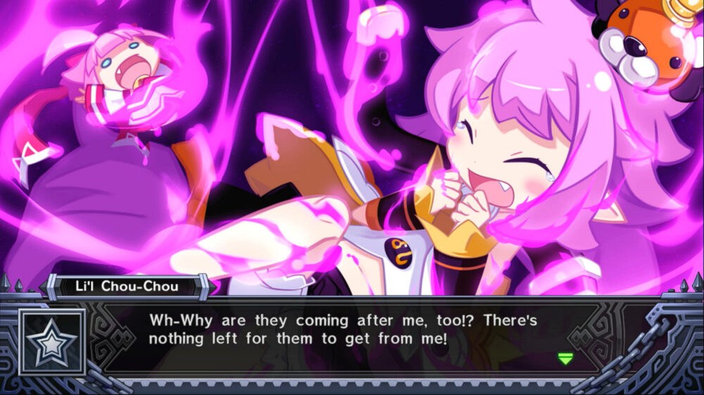 Here, Lady Chou-Chou, the so-called undisputed goddess of the seven worlds, is now trying to conquer twelve more worlds along with her companions that she met in the first game. It’s a very common thing for gods to do I guess, but where it starts going crazy is when you eventually start a spaceship battle and transform your ship into an epic robot. Okay, actually that seems somewhat normal as well… but get this, Chou-Chou, who got sucked into a coffin after meeting Syrma, an ultimate goddess, shrunk into this small little chibi-sized Chou-Chou (and yes, I know I just said small, little and chibi in one sentence).